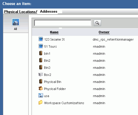 The Choose an item screen is displayed when you click Edit for the Shipping Address. Only address objects, if other objects are listed as well, are valid choices.