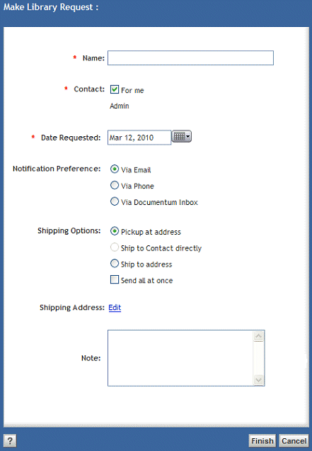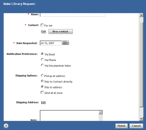 | *Contact | Use this attribute to make a library request for yourself or to make it for someone else. Deselect the For me option when making the request for someone else. Click Edit if you need to add or change a contact. Click the New contact button, revealed to Retention Managers only, if you cannot find the needed contact from the existing list using Edit. |