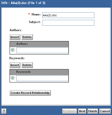 Authors | The value you type for this field should identify the author of the document that is being declared a formal record. You can Insert additional fields to identify more than one author if necessary, though you are able to select only one using the radio button. You can also delete additional fields inserted by selecting the radio button and clicking Delete. NoteEach field inserted is reorganized, after the form is saved, so that it appears under the field that had the radio button selected. |